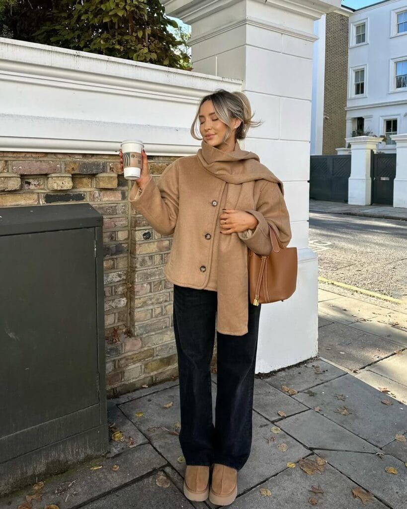 @ freyakillinThis outfit pairs a plush camel-colored jacket with a matching wrap scarf for ultimate warmth and style. Black wide-leg trousers, tan suede boots, and a softly structured tote make it the ideal casual winter getup for coffee runs and neighborhood walks!ā