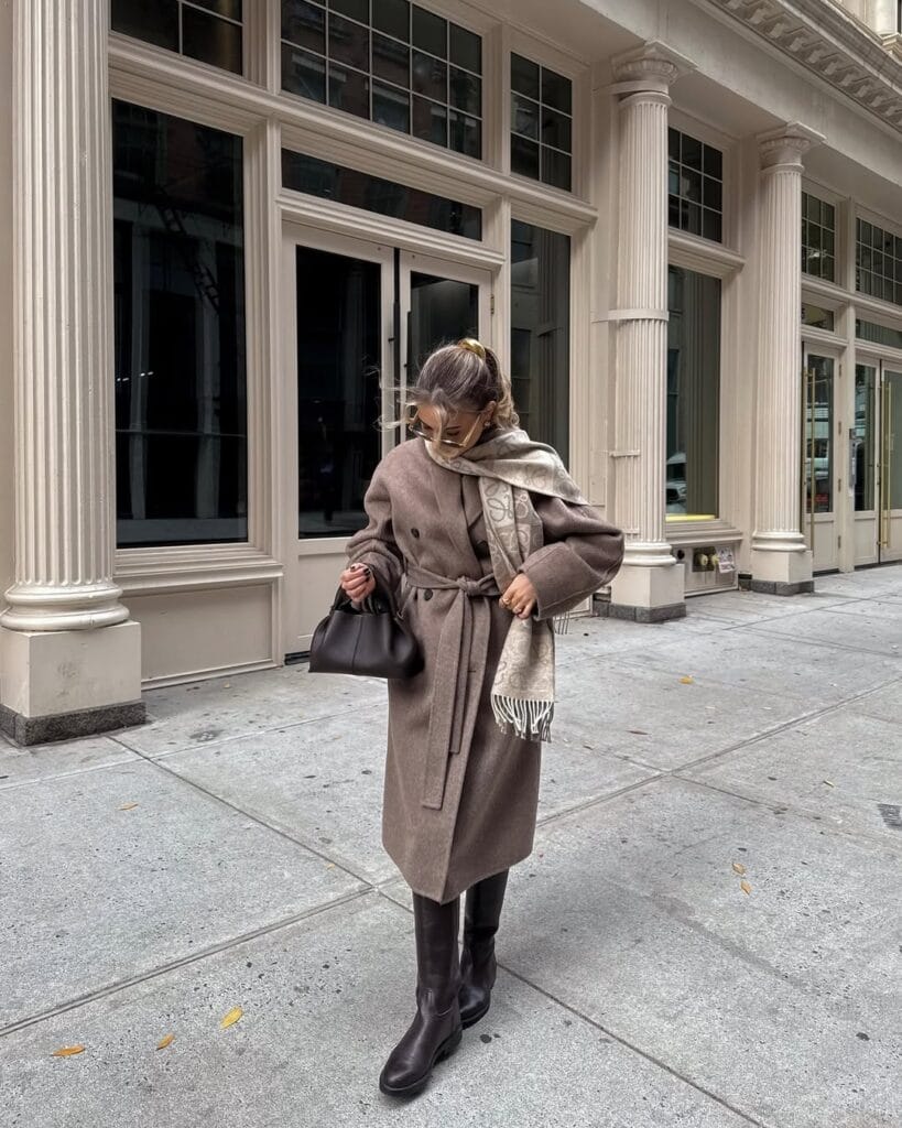 @ lilyisabellaclarkThis look is all about classic winter polish: a taupe belted wool coat layered up with a creamy patterned scarf for extra warmth and style. Sleek dark knee-high boots and a structured bag finish the vibe, making it perfect for a chic city day!ā