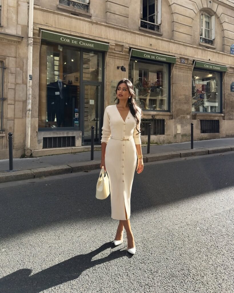 @ jarinpatShe’s serving elegance in a fitted cream knit dress that buttons down the front and ties at the waist. Paired with pointed white heels and a matching bag, this look is seriously timeless for a fall evening!