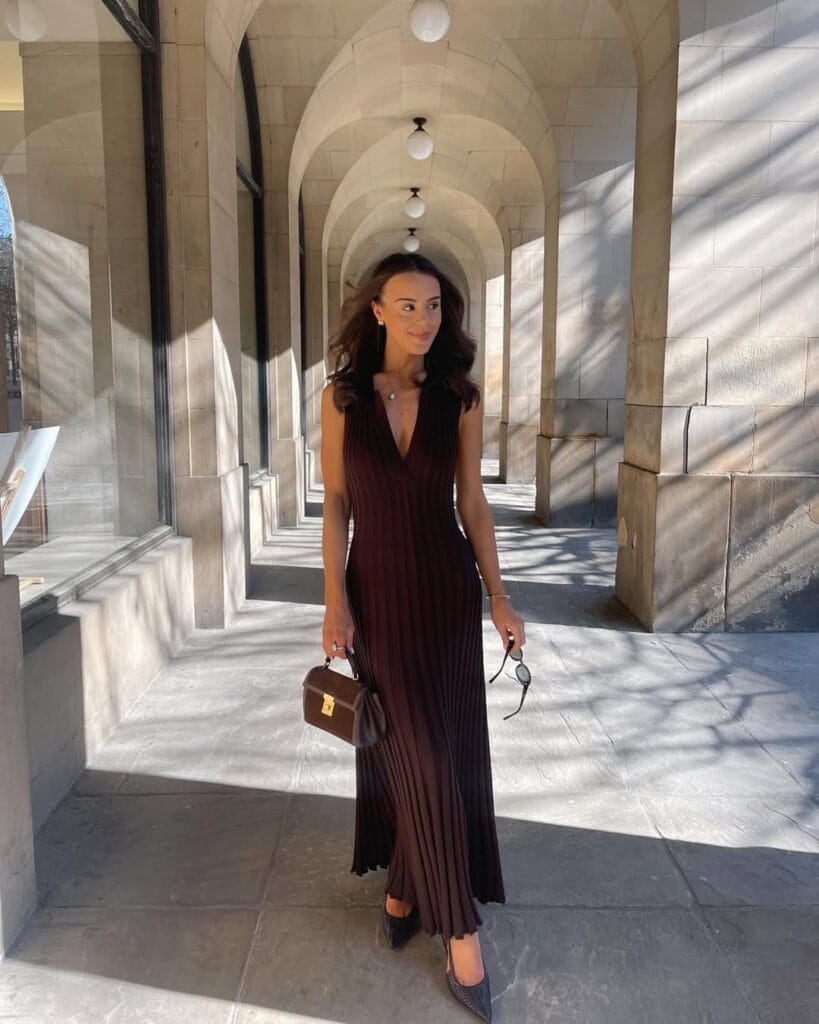 @ whatemworeShe’s channeling timeless sophistication in a deep brown pleated maxi dress that features a plunging neckline. The look is polished off with pointed black heels and a structured brown handbag—perfect for a romantic evening stroll!