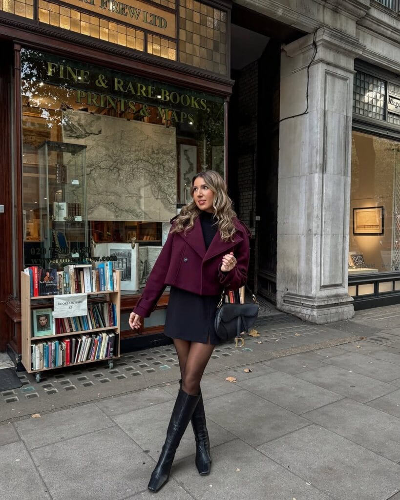 @ gemmatalbotTotally loving the vibe of this tailored mulberry cropped jacket over a black mini dress, matched with sheer tights and tall black boots. It’s fall date-night perfection, giving off chic library romance feels!