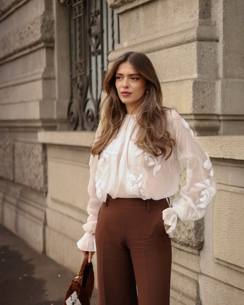 @ heloise.guilletShe’s dazzling in a delicate white sheer blouse with embroidered details, tucked into sleek high-waisted chocolate brown pants. The chic brown handbag and softly waved hair make this look sweet and effortlessly polished for a cozy fall date night!