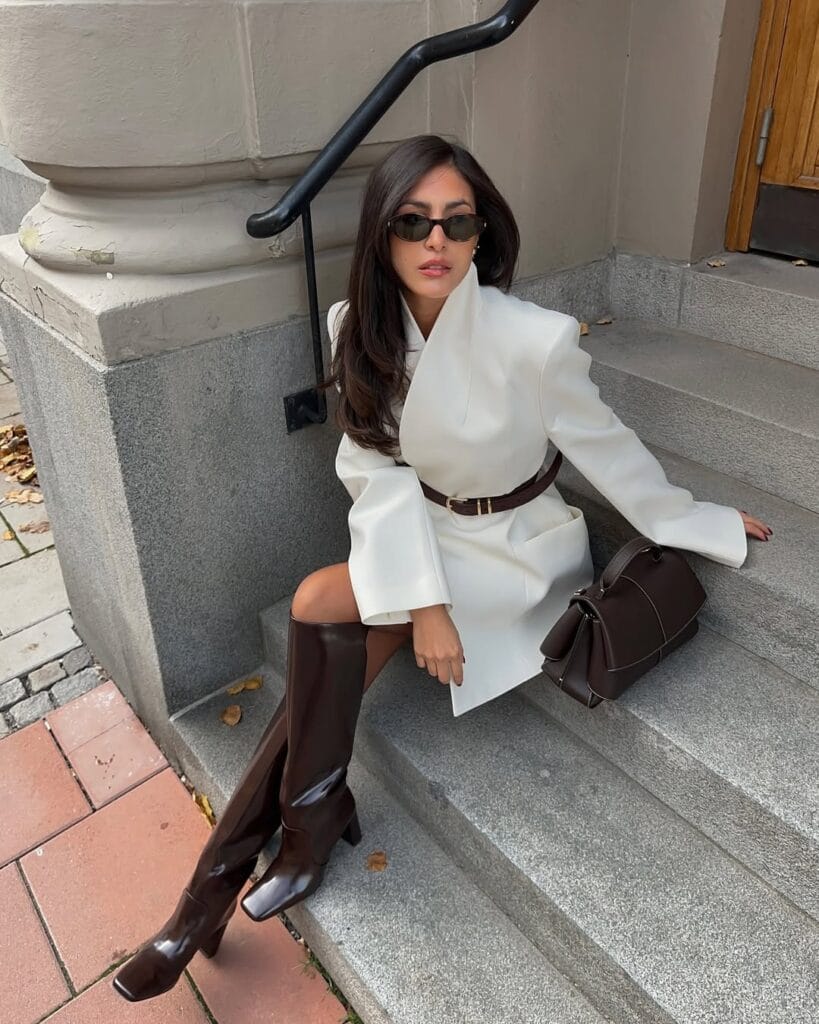 @ estheraguirreThis stunning cream wrap coat cinched with a brown belt is giving serious sophistication, paired perfectly with glossy chocolate knee-high boots. The matching structured brown bag completes the look—so classic for an upscale autumn evening out.