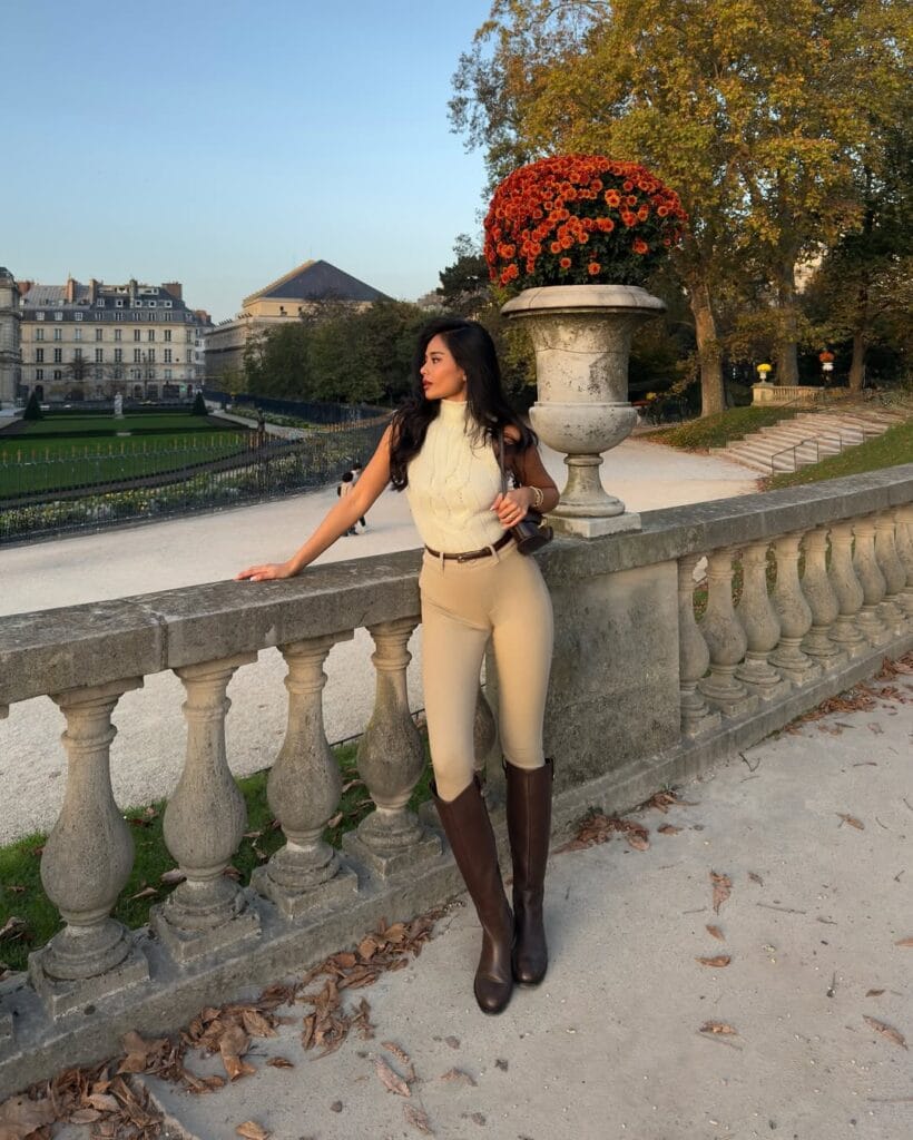 @ jarinpatShe’s channeling classic equestrian vibes in a cream cable knit sleeveless top tucked into fitted beige riding pants. The tall brown boots and slim belt tie the whole look together—effortlessly chic for a crisp autumn date!