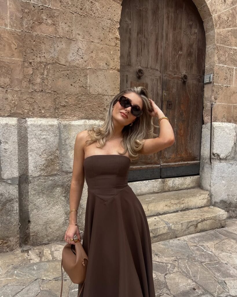@ lilyisabellaclarkShe’s channeling effortless romance in a structured, strapless chocolate brown maxi dress with a softly flared skirt. A matching brown mini purse and gold jewelry make this the perfect dreamy look for a special autumn evening out!