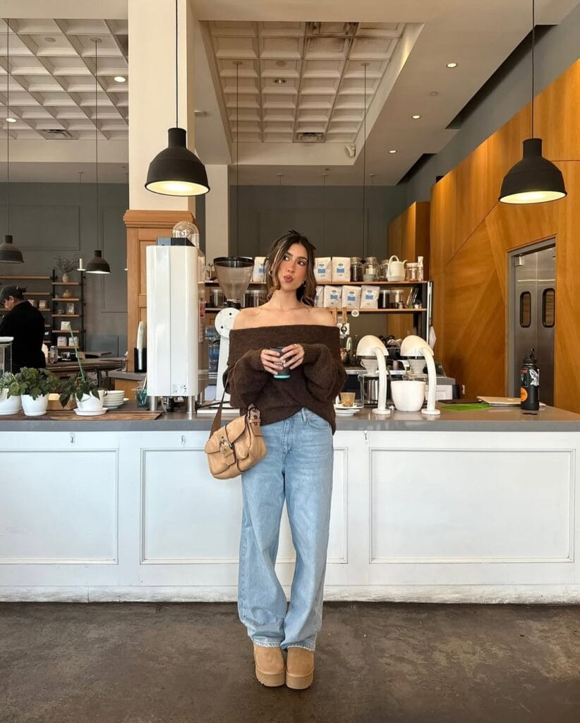 29. Cozy Off-Shoulder Knit Sweater with Relaxed Denim