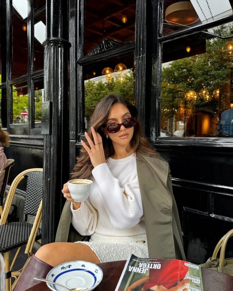 @ sophiemouldsHere’s an easy Parisian moment—a soft ribbed white sweater paired with a cozy textured cream mini skirt. The light trench draped over her shoulders keeps it casual-chic, totally perfect for sipping coffee on a crisp, romantic morning.