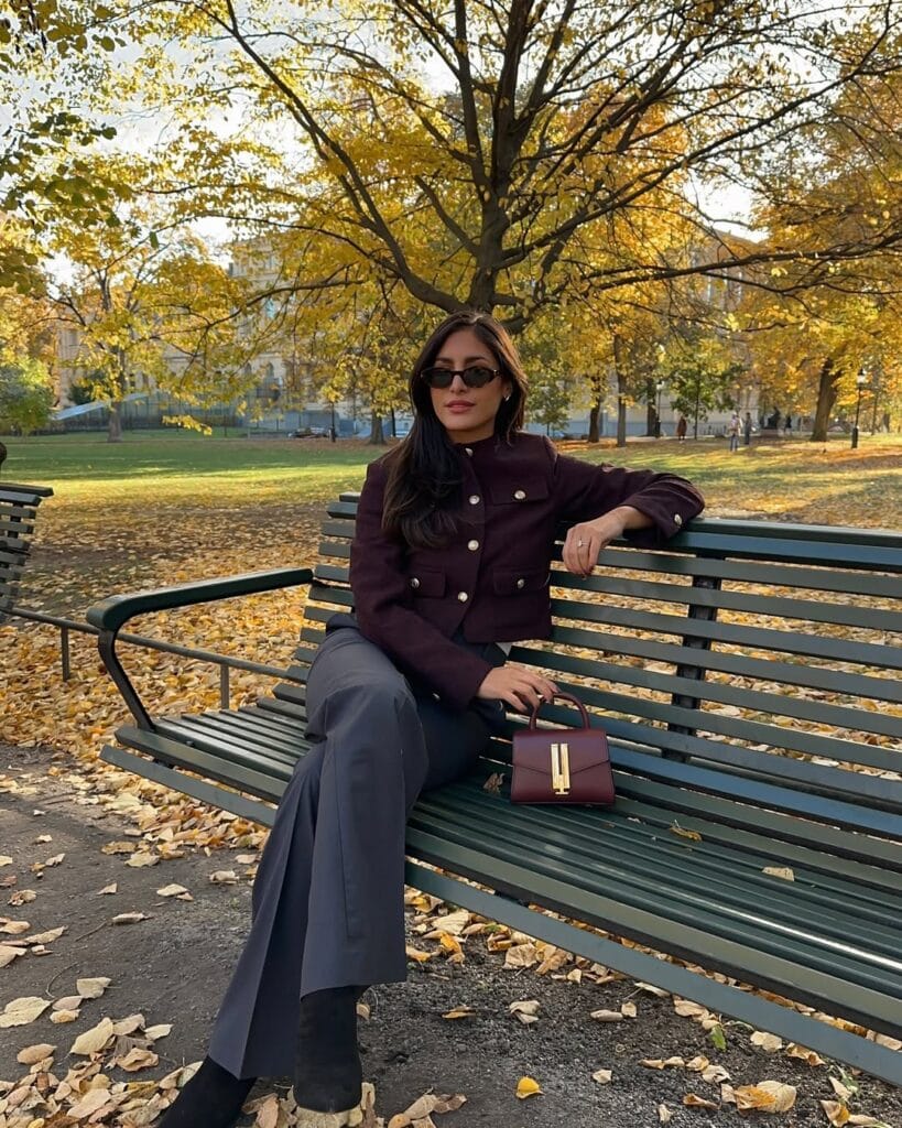 @ estheraguirreShe’s giving luxe autumn vibes in a rich plum blazer—gold buttons and all—paired with flowing charcoal flared trousers. The structured mini handbag and sleek boots complete this polished, park-bench-chic fit.