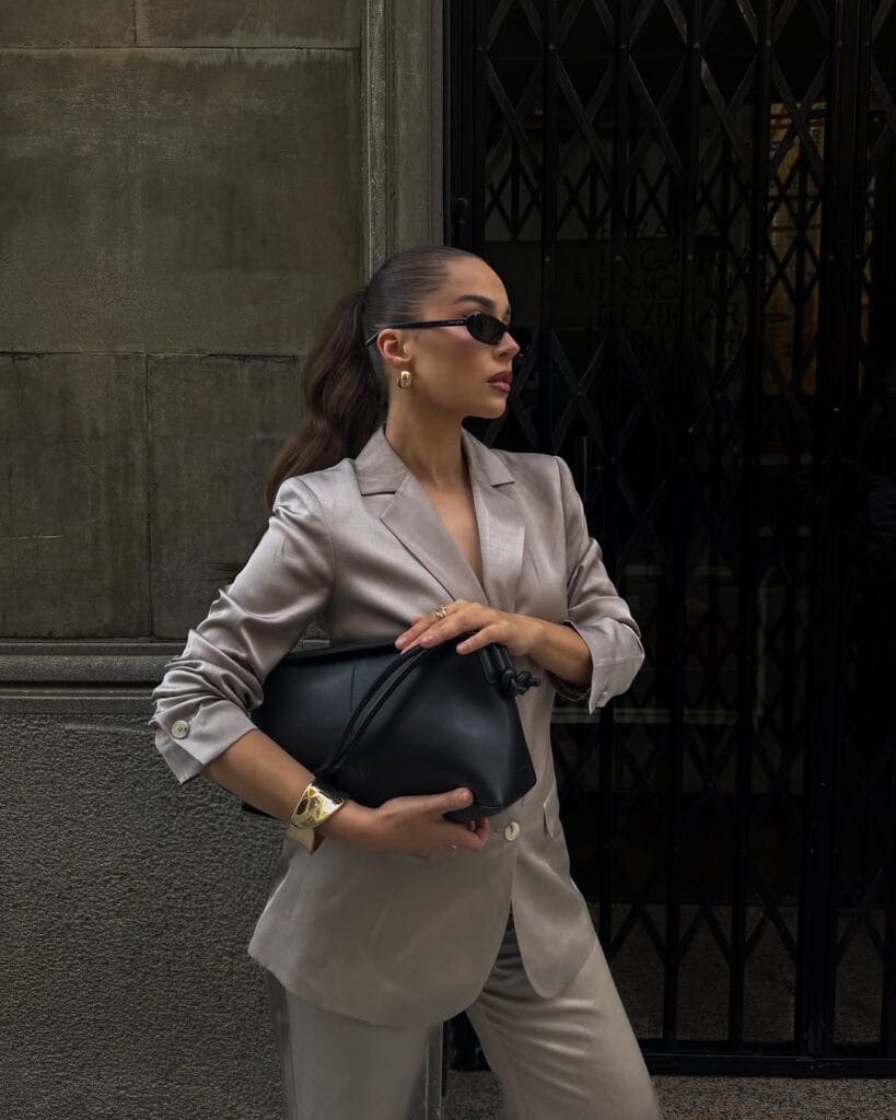 @ anna.weinShe’s owning the evening in a pearly grey satin blazer suit—tailored to perfection with matching trousers and statement gold jewelry. The oversized black clutch and polished hair pull it all together for serious date night glam!