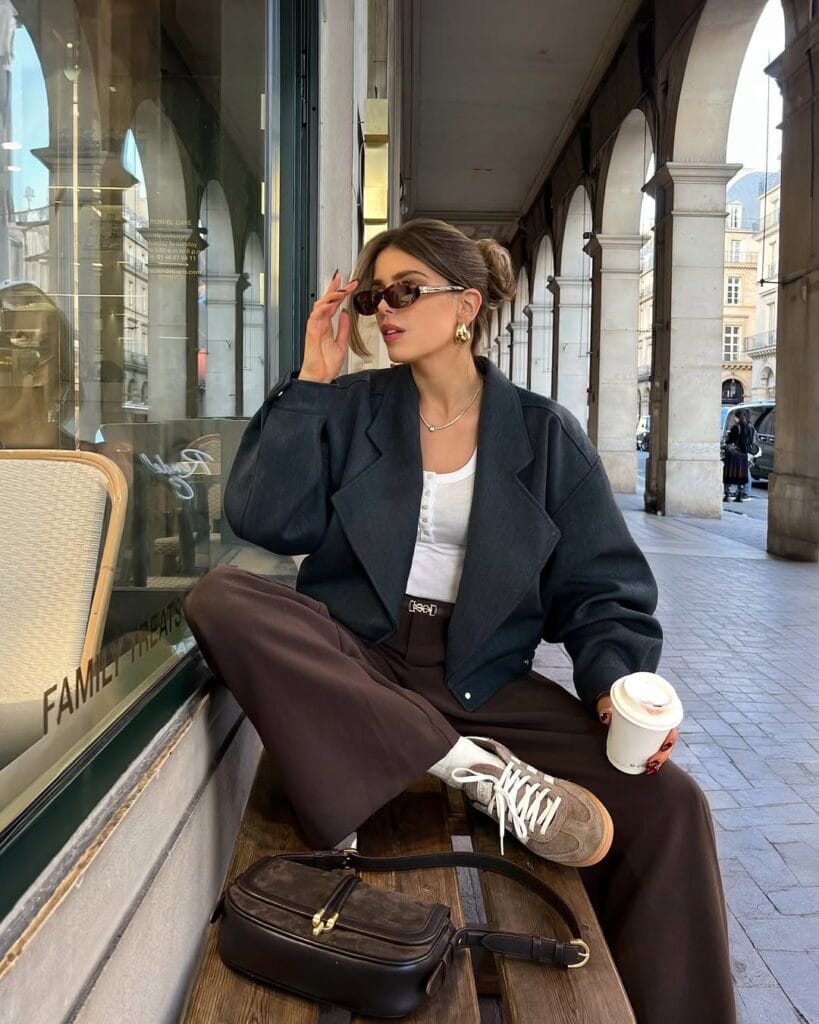 @ heloise.guilletServing major Parisian-cool energy, this fall look is all about cozy-meets-casual sophistication. She’s rocking a crisp white tank under a slouchy charcoal blazer, paired with flowy chocolate wide-leg trousers and vintage-inspired sneakers for strolling the city in style. A minimalist brown bag and gold hoops tie it all together—proof that comfy and chic can totally be best friends this season.