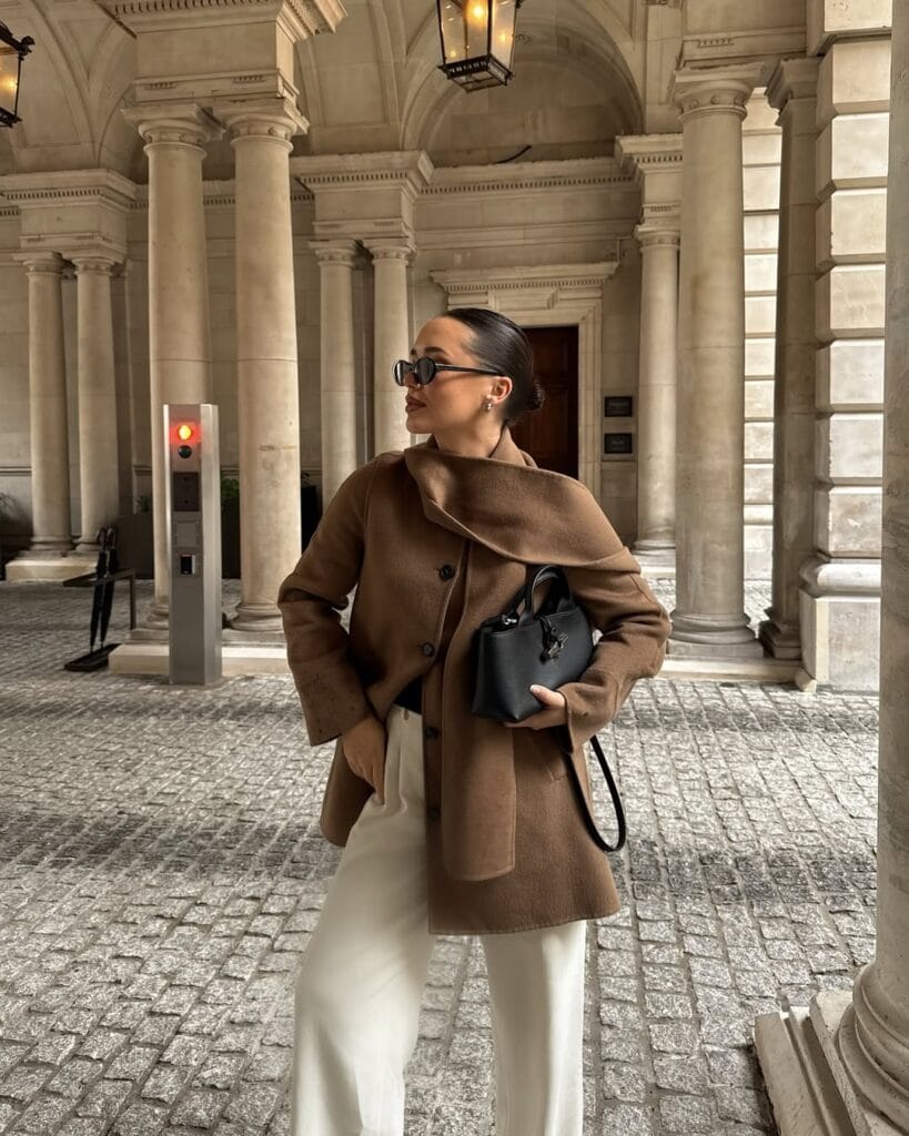 @ fleurraffanIf effortless sophistication had a fall uniform, this would be it. She’s styled a sculptural camel wrap coat over crisp ivory tailored trousers, creating the perfect balance of cozy and chic. A petite black top-handle bag adds just enough polish for city strolls or coffee dates—proof that neutrals never look boring when layered thoughtfully.