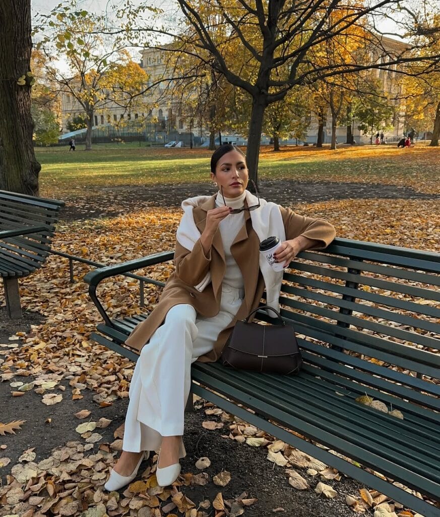 @ estheraguirreCatch cozy autumn vibes in this ultra-chic, latte-inspired outfit! She’s wrapped up in a tailored caramel wool coat layered over a creamy sweater and wide-leg white trousers, perfectly paired with pointed cream mules for that touch of polish. Add a structured black handbag and a to-go coffee cup, and you’ve got the ultimate look for leisurely fall afternoons and stylish strolls through golden leaves.