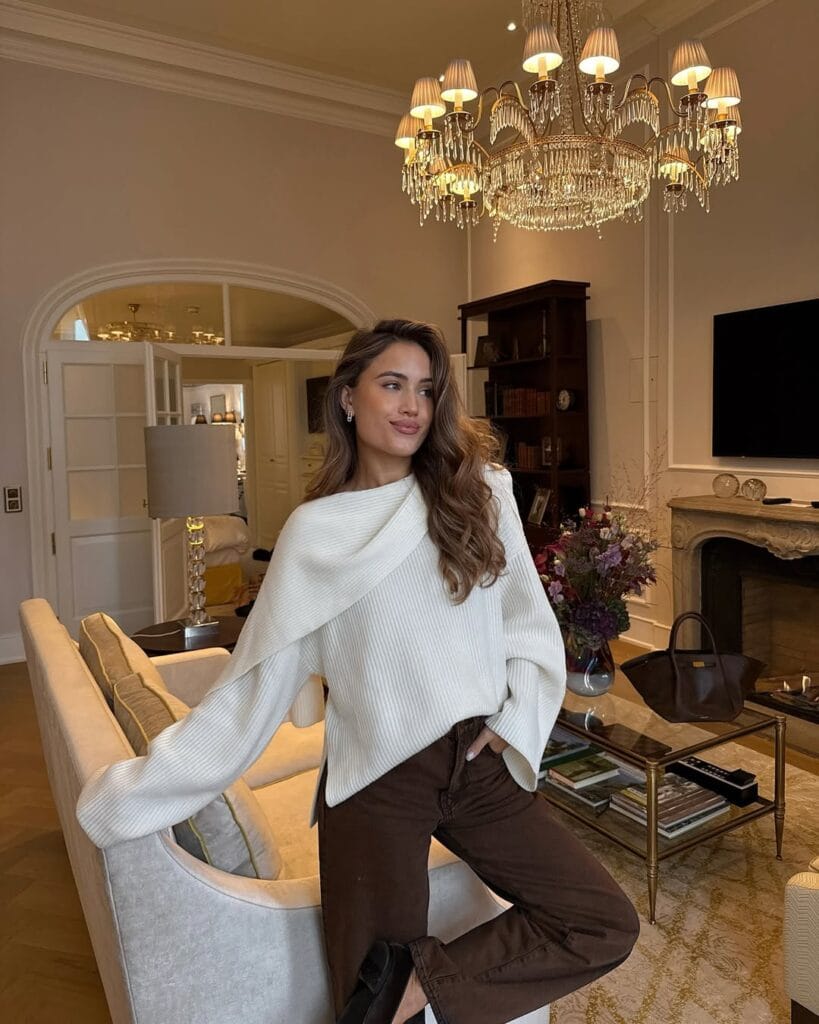 31. Cozy Mocha Sweater with White Trousers