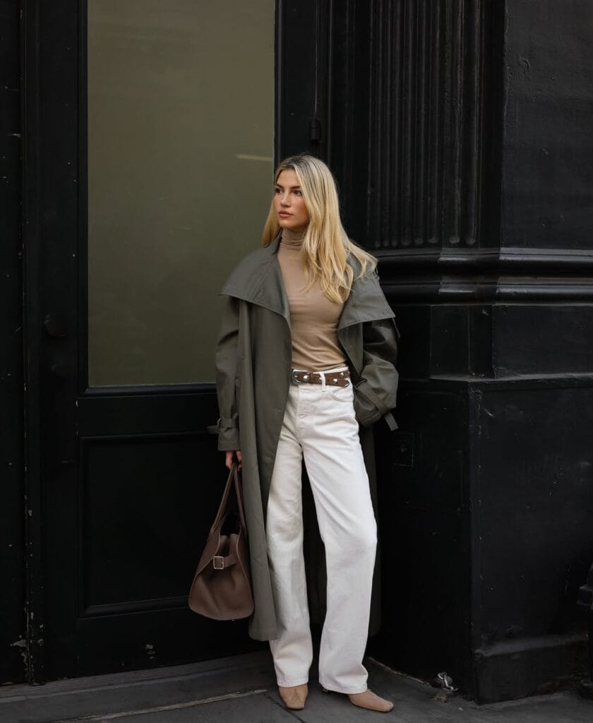 10. Olive Trench Coat with Taupe Turtleneck and White Jeans