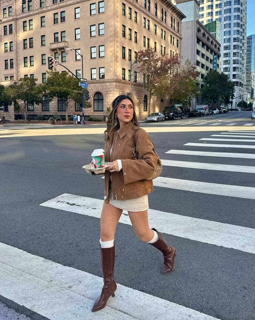 @ taniabydayUpping the fall style game with city-cool vibes, she’s rocking a luxe caramel suede jacket over a cream mini skirt—hello, leg-lengthening magic! Classic knee-high brown boots, cozy white socks, and a chic shoulder bag bring all the autumn energy, while a festive coffee in hand seals the “effortless, out-the-door” look. Perfect for those crisp strolls where you want to turn heads at every crosswalk!