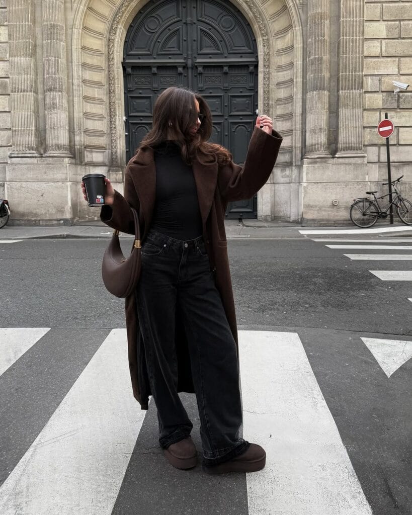 @ lucygrasssoThis look is autumn’s answer to laid-back luxury! She’s layered a rich chocolate overcoat atop a sleek black fitted tee and the coolest wide-leg black jeans, grounding the outfit with matching chunky platform slippers. With a minimalist brown shoulder bag and a coffee-to-go, this is your go-anywhere, look-good-everywhere city stroll uniform for fall.