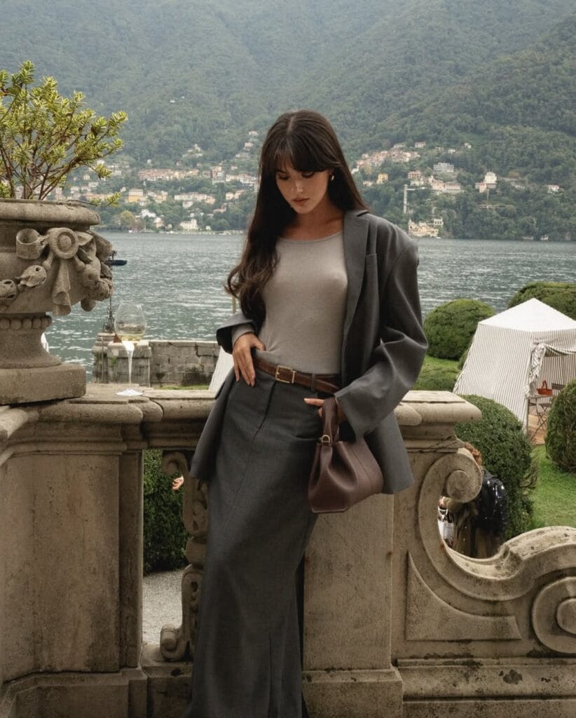 @ paola_cossentinoChanneling pure main character energy, this fall-ready ensemble is a lesson in modern power dressing. She’s styled a tailored charcoal blazer over a soft taupe knit tank, with a matching long skirt for a streamlined silhouette. Finished with a brown leather belt and an on-trend slouchy shoulder bag, this look is made for lakeside brunches and statement-making strolls.