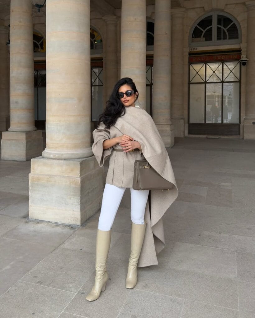 @ jarinpatIf understated elegance is your vibe, this outfit is your autumn muse! She’s styled a flowing oatmeal-toned cape over a belted knit sweater, paired with crisp white skinny pants for fresh contrast. Add sleek cream knee-high boots and a taupe designer bag—this cozy-chic combo is pure city sophistication, ready for any leaf-littered stroll or stylish coffee run.