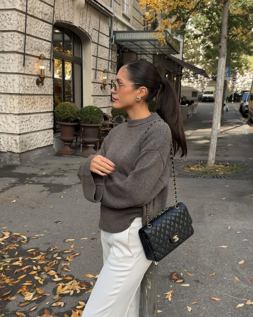 @ estheraguirreClassic city chic, upgraded for the season! She’s keeping it effortless yet elevated in a relaxed graphite knit sweater teamed with crisp ivory tailored trousers—the ultimate contrast for sophisticated, on-the-go style. The quilted chain-strap bag in timeless black adds just the right touch of luxury, while delicate statement earrings complete the look. Perfect for sidewalk strolls, alfresco coffee moments, or simply making autumn days a little more beautiful.