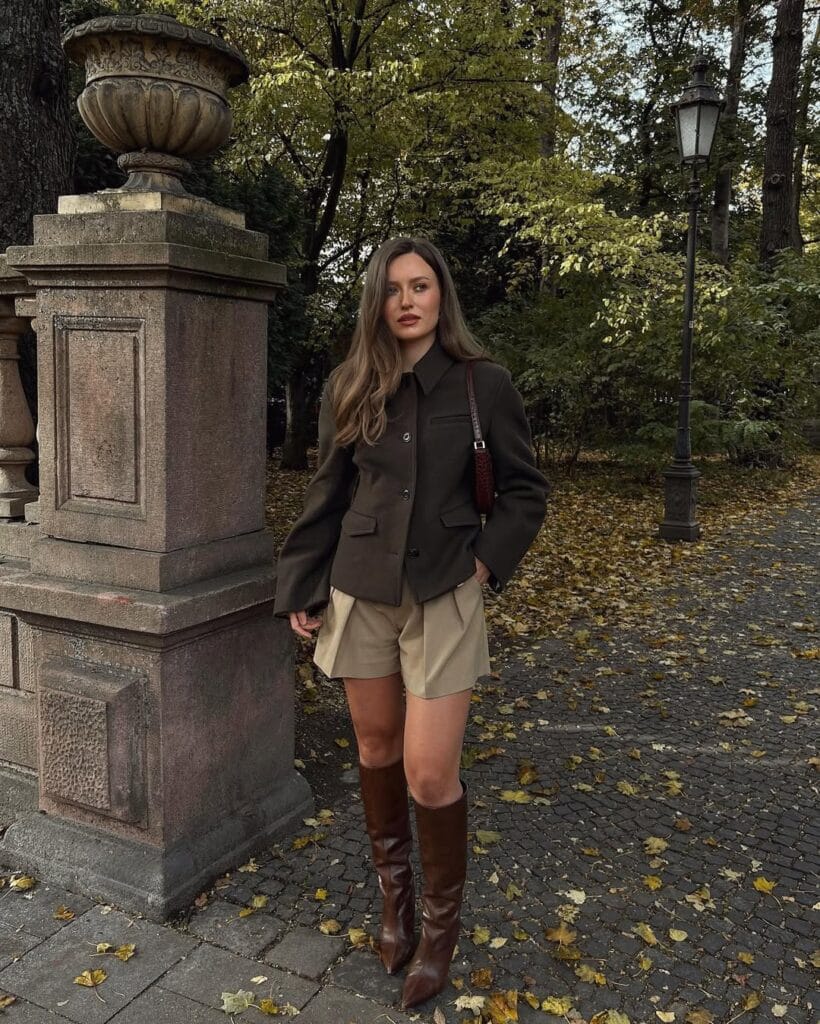 11. Dark Brown Blazer with Beige Shorts and Knee High Boots
