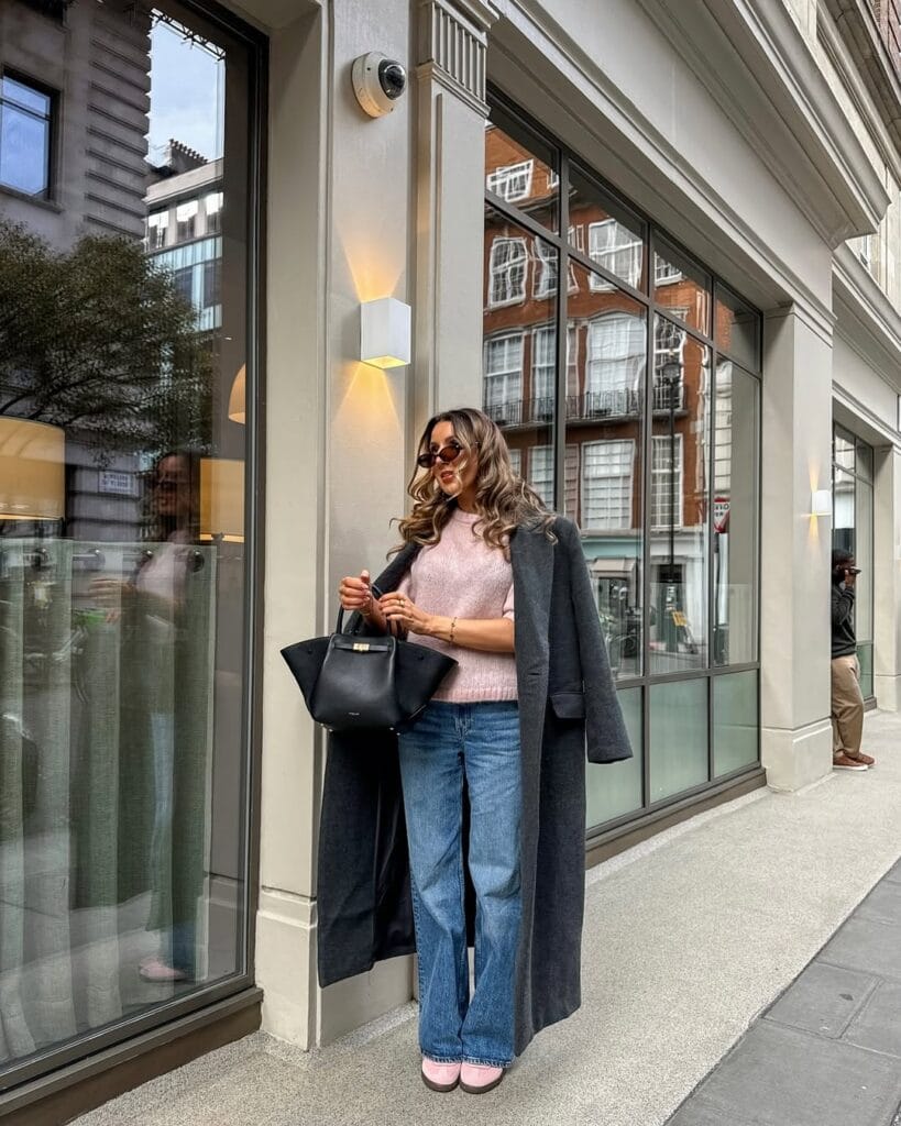 33. Blush Sweater with Blue Wide Leg Jeans and Charcoal Coat