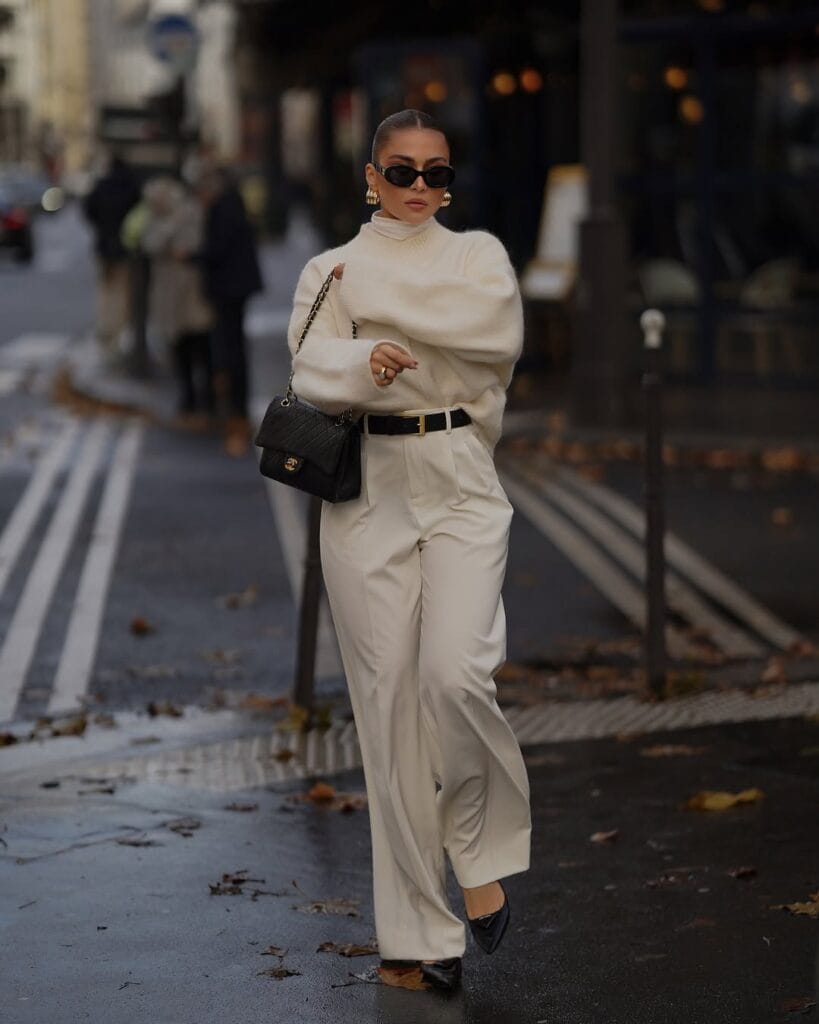 @ anna.weinThis look is a stunning masterclass in modern minimalism and effortless elegance. She’s styled a plush, creamy-white fuzzy sweater with relaxed, high-waisted ivory tailored trousers—cinched sharply at the waist with a sleek black belt to add contrast and structure. Black pointed-toe heels and a classic quilted black chain-strap bag bring instant Parisian polish, while statement gold earrings elevate the ensemble for an extra touch of glam.