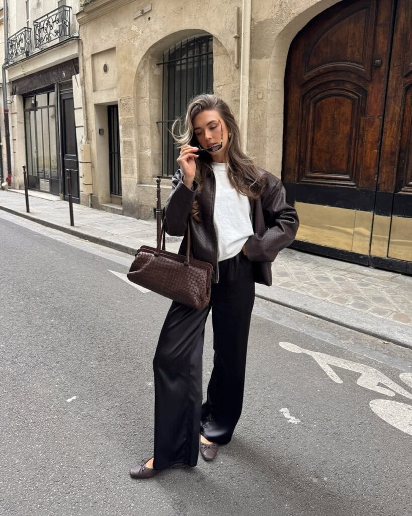 @ amelie_weissenbergerClassic, relaxed, and quietly luxe—this look is all about elevated neutrals for a chic city day. She’s styled a rich brown leather jacket over a soft white top, paired with flowing black wide-leg trousers for that effortless drape. A woven espresso tote and timeless ballet flats add texture and a touch of Parisian flair. This is understated confidence: perfect for morning café runs, strolls down cobblestone streets, or just embracing fall’s cool air with style and ease.