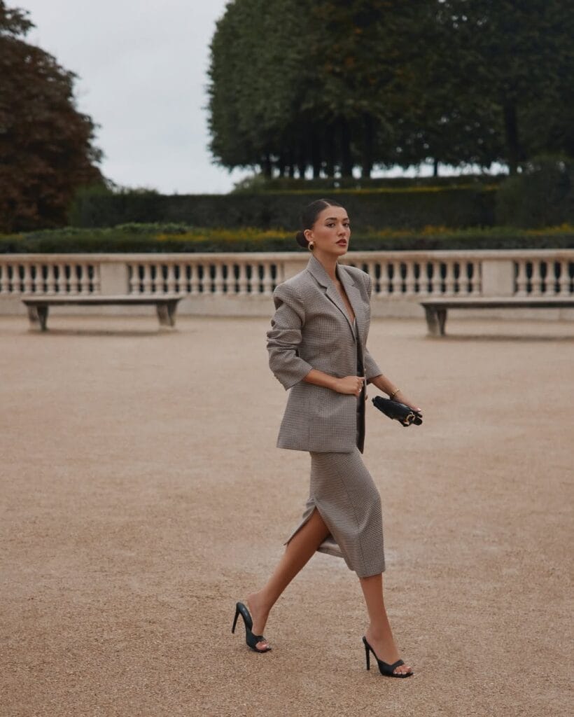 @ sherienboniThis look is a masterclass in polished, city-smart neutrals with a tailored twist. She’s styled a softly oversized checked blazer with a coordinating midi pencil skirt for maximum impact. Black heeled mules and a chic chain-handle bag add sleek contrast and elevate the entire ensemble. It’s the perfect ensemble for autumn strolls in iconic city parks or making any sidewalk feel like a European avenue.