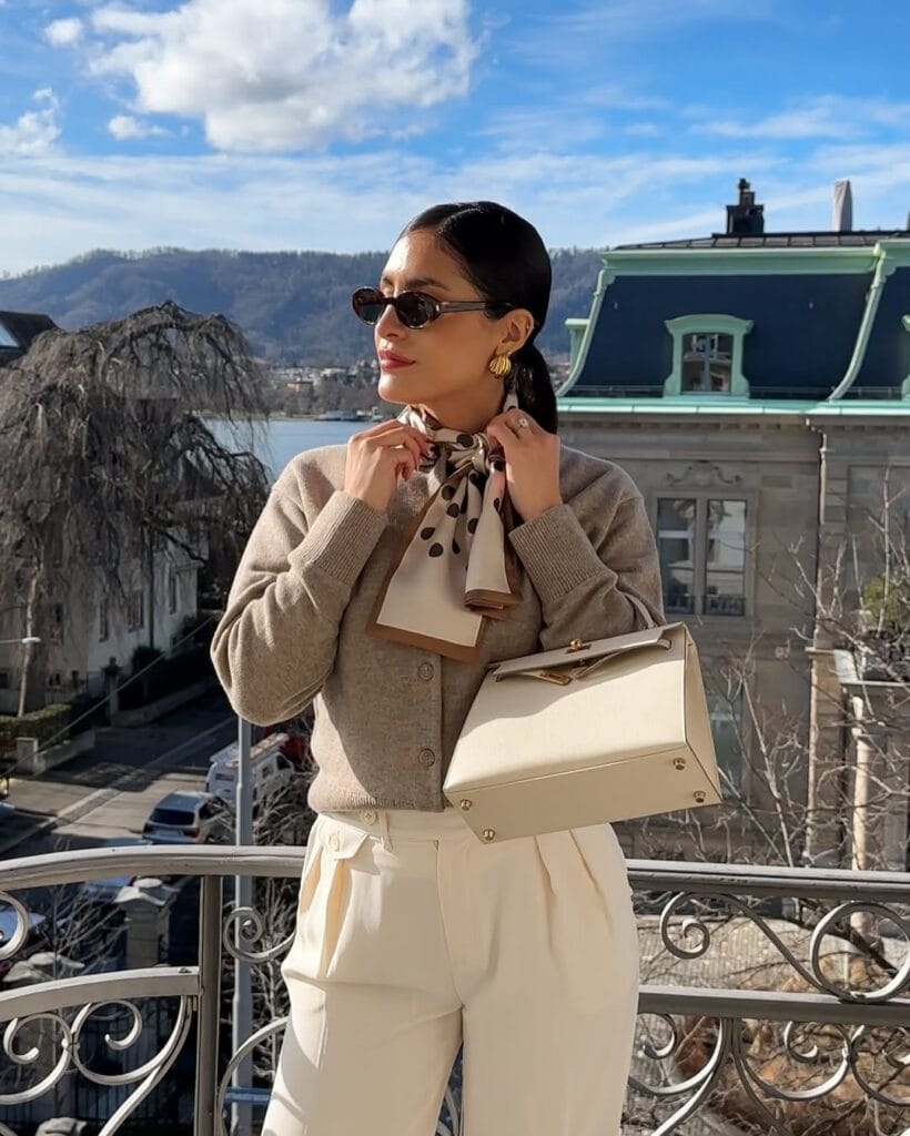 @ estheraguirreChic neutrals never looked so luxe! She’s nailing fall sophistication with a soft beige cardigan tucked into crisp ivory pleated trousers, finished off with a silky polka-dot scarf for that touch of Parisian panache. A structured cream top-handle bag and gold statement earrings pull it all together—making every city stroll feel like a runway moment.