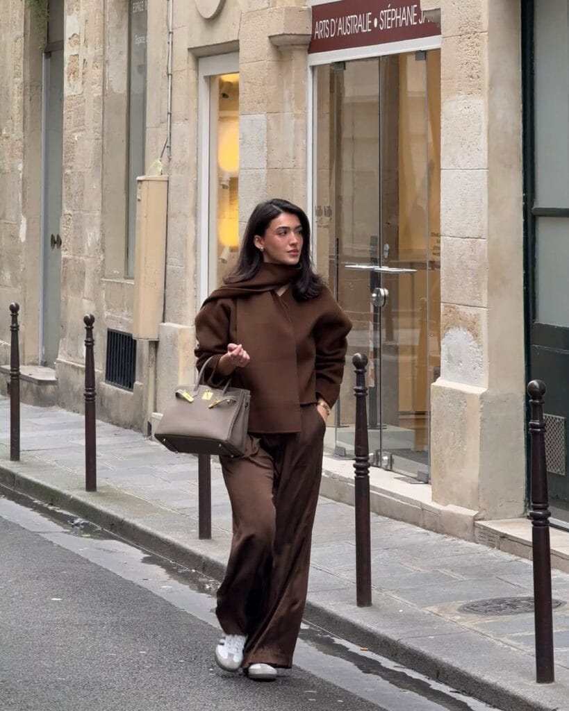 @ sherienboniIs there anything more effortlessly cool than stepping out head-to-toe in rich chocolate tones? This cozy, oversized sweater paired with wide-leg satin trousers is giving major “fall in the city” energy. Finish with crisp white sneakers and a statement tote for an on-trend look that screams both comfort and sophisticated style—your fall wardrobe just found its new hero!