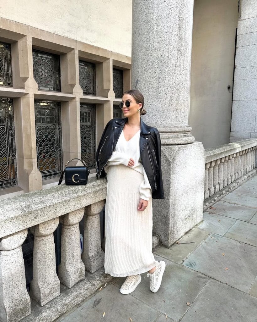 @ nadiaanya__Who says you can’t mix sweet with a little street? She’s layered a creamy knit midi dress with a classic black leather jacket for the perfect blend of cozy and cool. Finished with crisp white sneakers, a chic black top-handle bag, and gold earrings, it’s the ultimate city-girl outfit for fall days when you want to turn sidewalks into your personal runway.