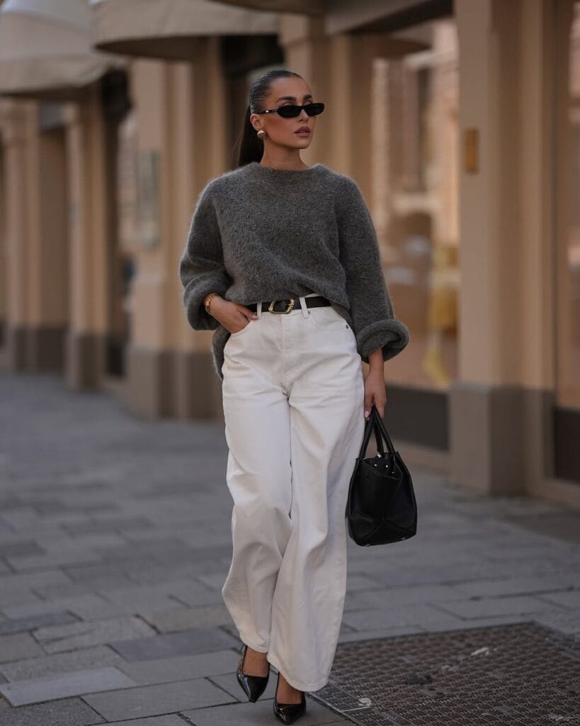 @ anna.weinNothing says fall like this combo of snuggly knits and crisp white denim! A plush grey sweater tucked into wide-leg white trousers gives city-chic sophistication, while black accessories tie everything together. It’s one of those looks you’ll reach for again and again—stylish, comfy, and perfect for grabbing coffee or strolling leafy avenues with your besties.