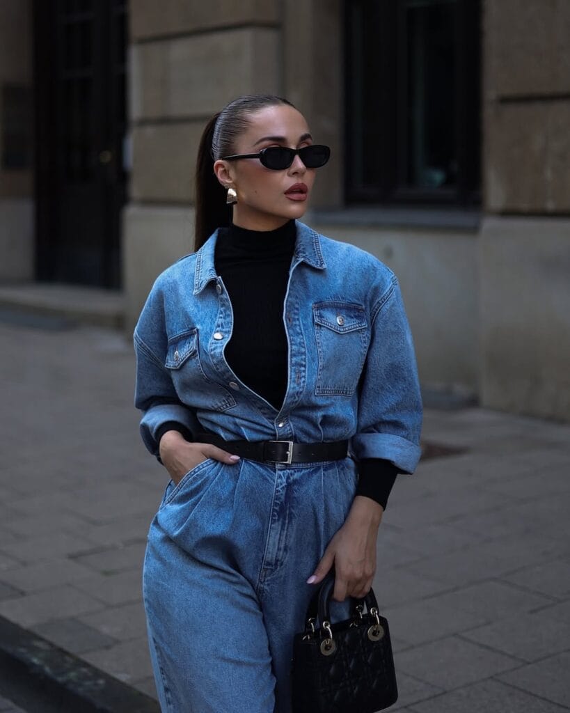 @ anna.weinDouble denim gets a major upgrade in this effortlessly cool fall look! She’s rocking a classic blue denim jumpsuit, cinched at the waist with a bold black belt for extra polish. A sleek black turtleneck base, chunky gold earrings, and a structured quilted handbag complete the vibe—proving comfy denim can still serve major city style.