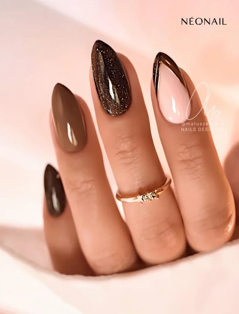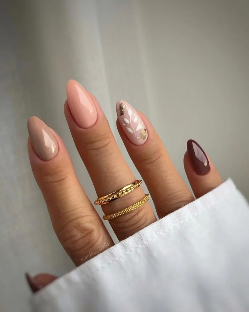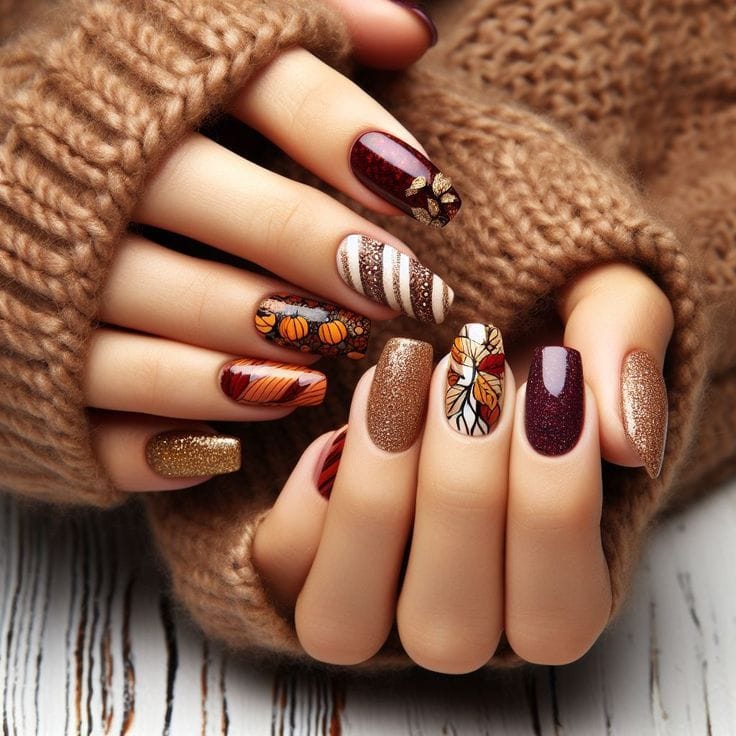 Embrace the rich hues of fall with nails painted in shades like mauve, deep brown, and burgundy.