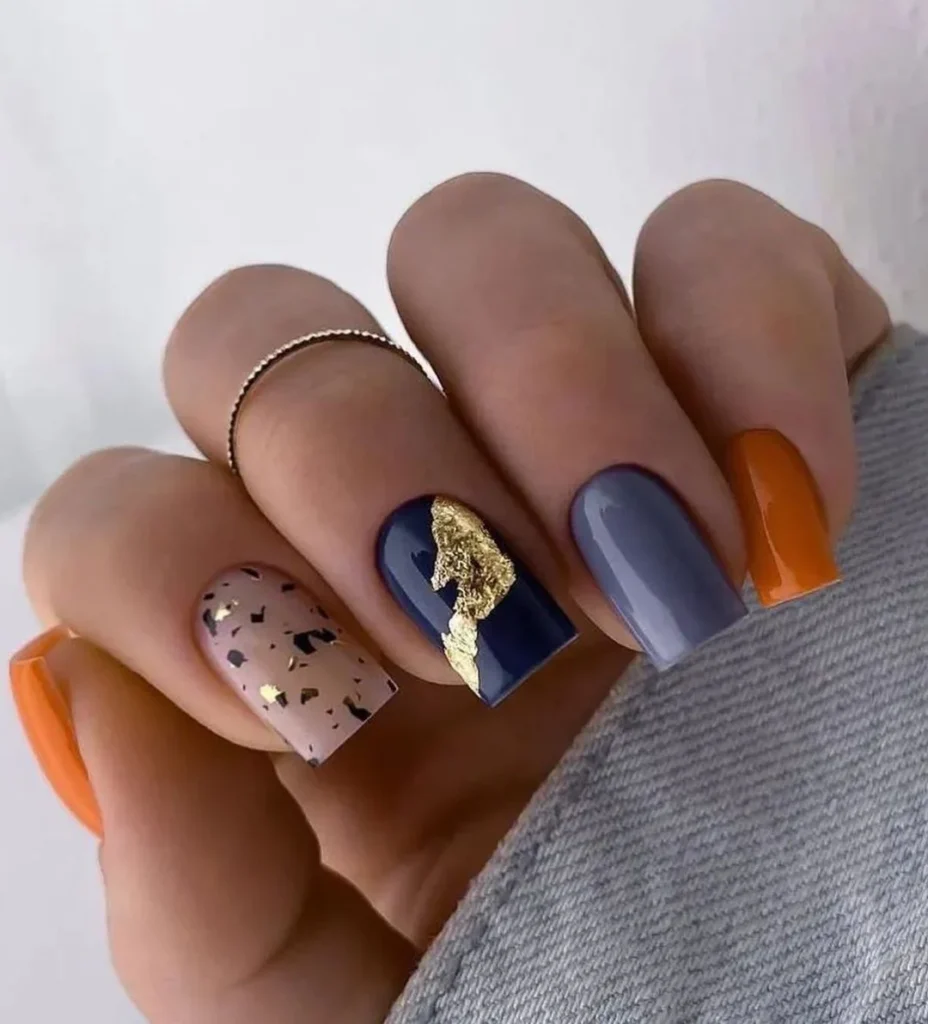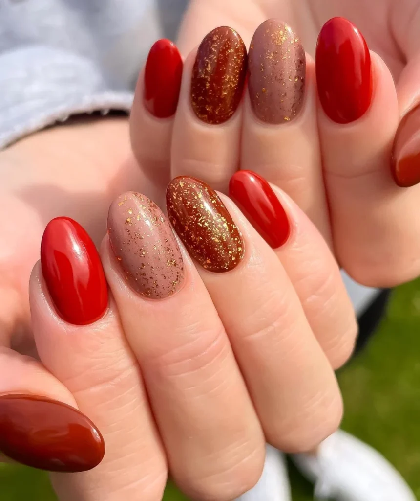 Gold accents or full gold nails bring warmth and sophistication to your autumn beauty routine, reflecting the cozy glow of the season.