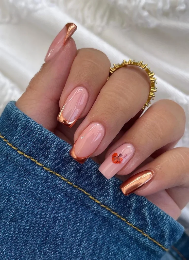 Metallic finishes in shades like copper, bronze, or silver add a modern and edgy twist to your fall nail look, perfect for those who love to make a statement.