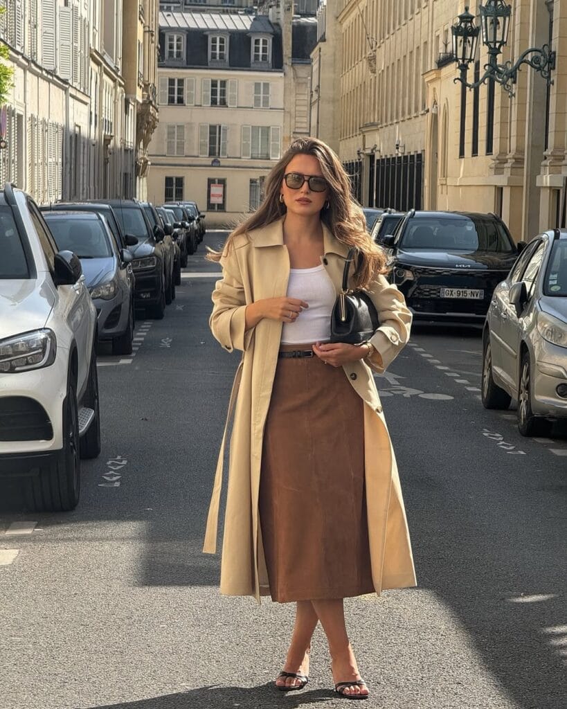 @ livia_auerHereās your new fall uniform: a classic white tank is topped with a flowy tan trench coat, paired with a brown suede midi skirt. Simple, sophisticated, and perfect for city strolls.