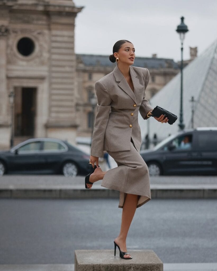 @ sherienboniHello, power dressing! The outfit features a sharply tailored plaid blazer with bold gold buttons and a matching midaxi skirt for head-to-toe polish. The structured fit and muted tones are giving major city sophisticationāperfect for making a statement on a busy street.