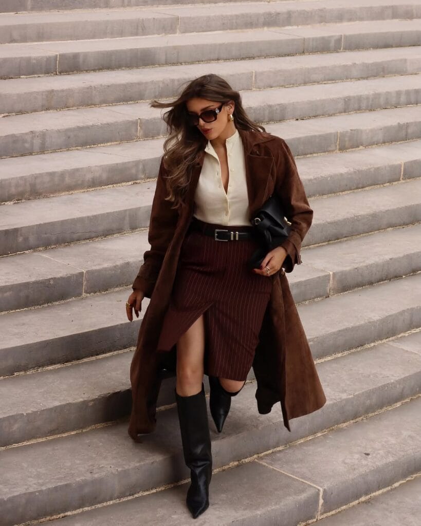 18. Rich Brown Duster Coat & Pinstripe Midi Skirt