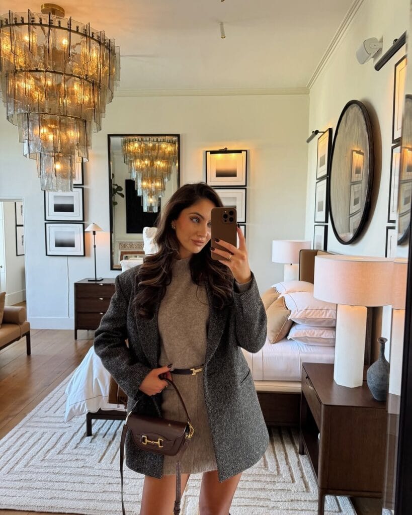 @ sophiemouldsSheās serving city-chic in a structured grey blazer layered over a cozy oatmeal sweater and a matching mini skirt. The look is styled up with warm knee-high boots and a cute crossbody bagātotally perfect for fall adventures!