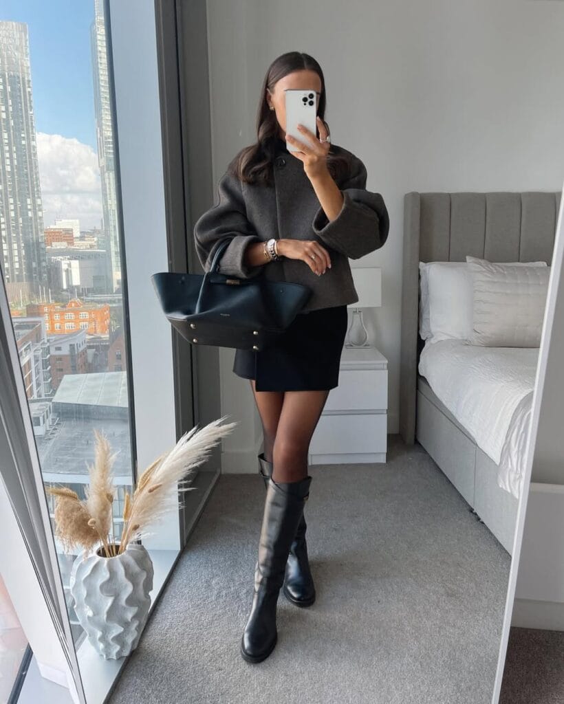 @ gemmatalbotFall layering goalsāshe matches a double-breasted knit jacket with a textured mini skirt, layered under an elegant long grey coat. Classic tall boots finish the look, making this outfit ideal for coffee runs or golden hour strolls!