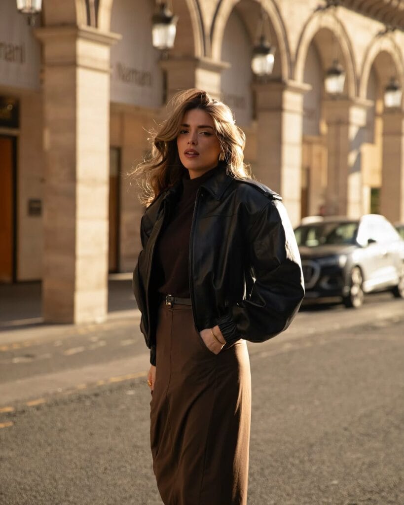 @ heloise.guilletShe nails fall layering with an edgy cropped black leather jacket over a chocolate brown top and matching midi skirt. The monochrome palette and soft sunlight set the mood for street-style confidence.