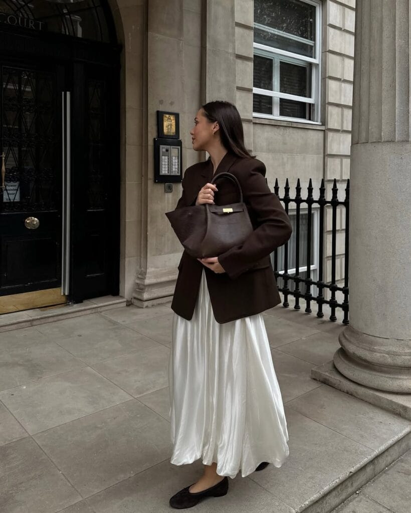 @ fleurraffanSheās serving modern classic in an oversized dark brown blazer with a flowing satin white maxi skirt beneathāan elegant, soft contrast for transitional weather. Black ballet flats and a roomy brown tote keep it understated and timeless.
