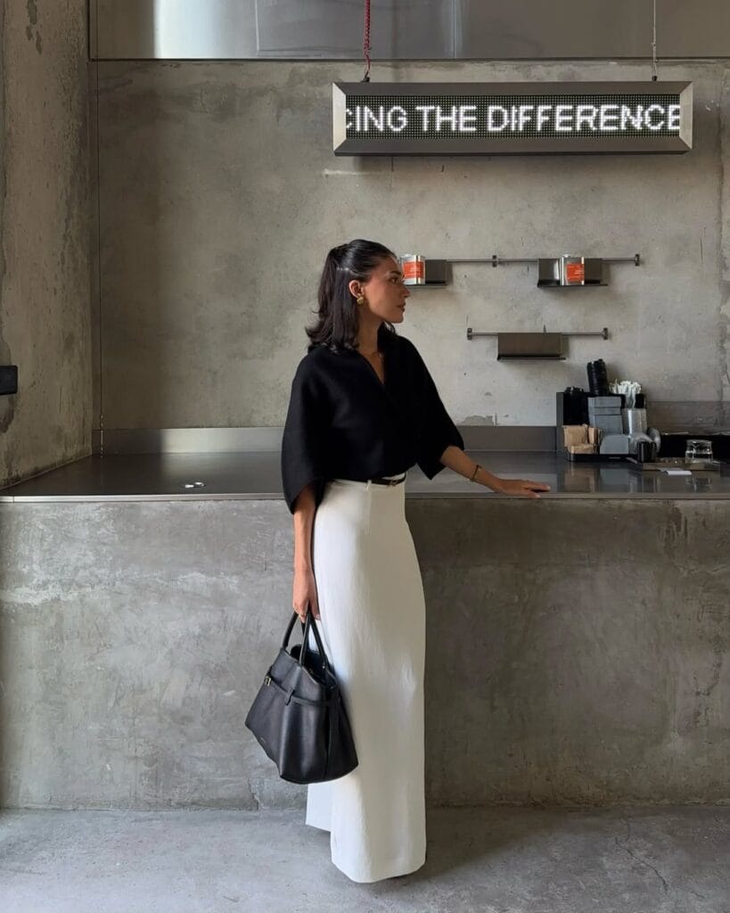 @ sherienboniShe pairs a chic black dolman sleeve top with an ultra-clean white maxi skirt for instant sophisticationāso minimal and modern. The vibe is gallery-goer meets Parisian cool, finished with a structured black handbag for an effortlessly refined finish.