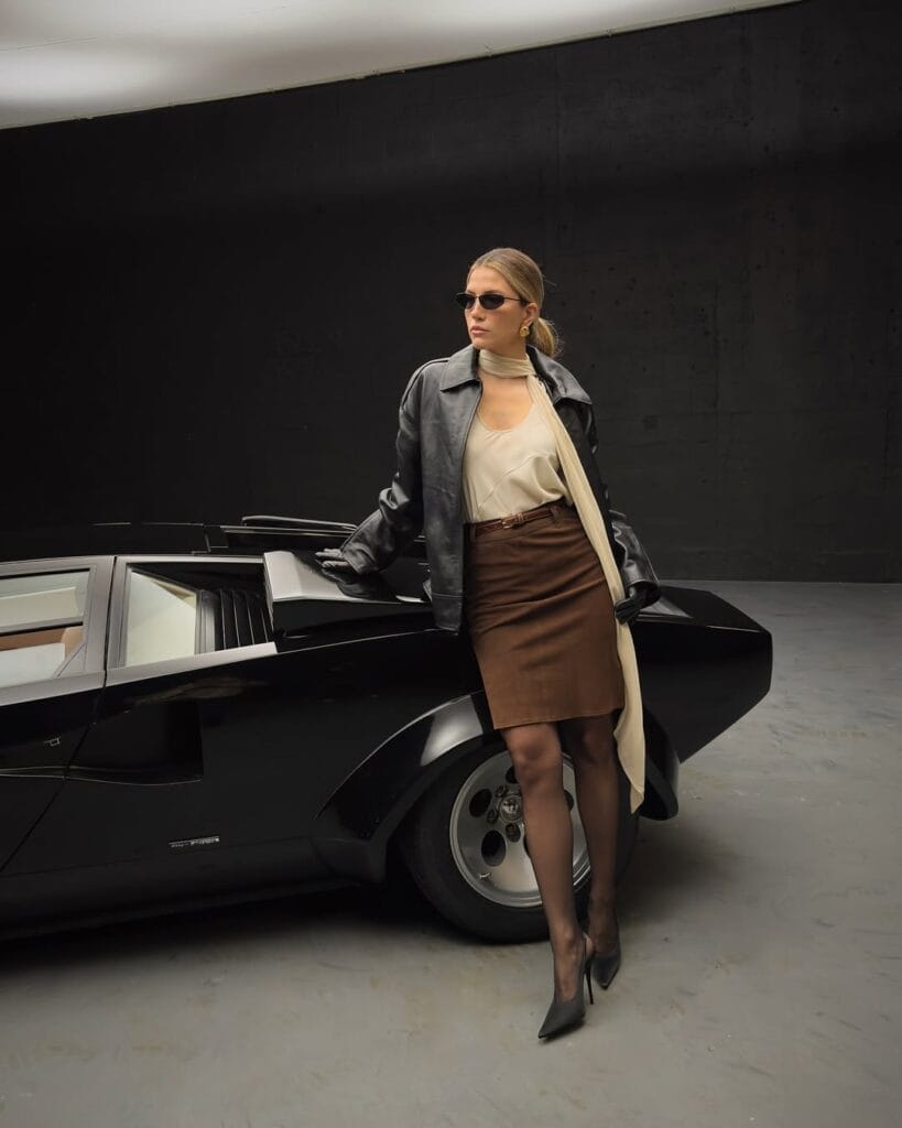 She nails retro-chic with a rich brown button-up jacket paired with a matching mini skirt, giving total fall style inspo. Sleek brown knee boots round out the set, keeping things sophisticated for a day of city adventures.