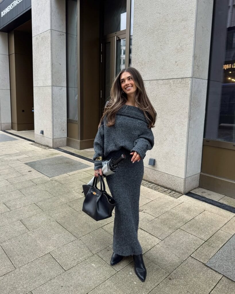 5. Cozy Charcoal Knit SetāOff-Shoulder Sweater & Maxi Skirt