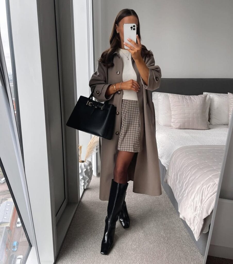 42. Tailored Taupe Coat & Chic Houndstooth Mini Skirt