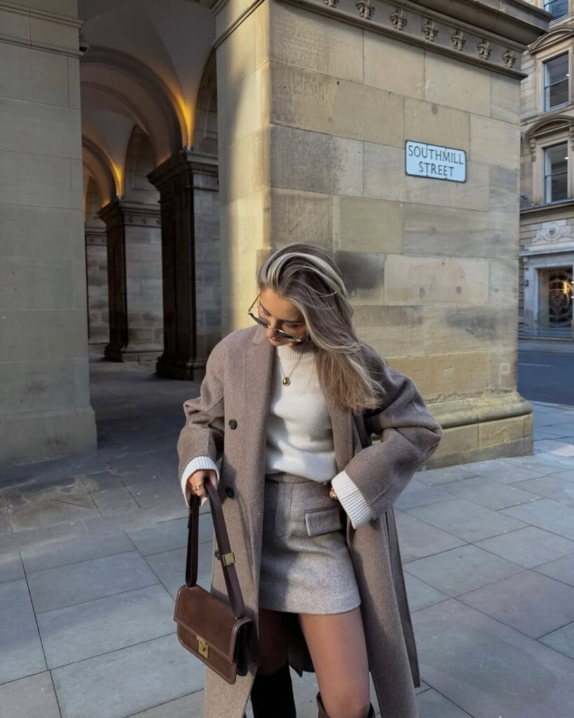 @ lilyisabellaclarkThis outfit is a cozy dream with a tailored taupe coat layered above a chunky cream knit and matching mini skirt. Warm brown knee boots and a chic brown shoulder bag add the perfect fall touchāsimple, coordinated, and super stylish!