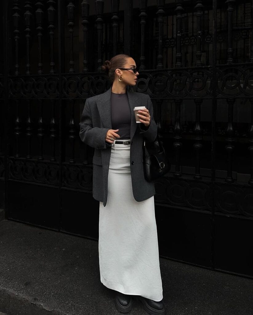 45. Modern Charcoal Blazer & White Maxi Skirt Ensemble