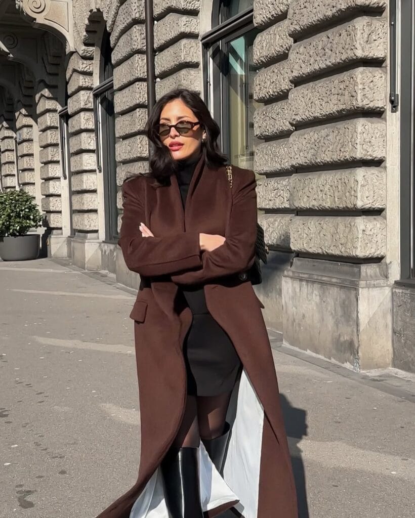 @ estheraguirreSheās serving ultra-chic fall style in a tailored dark brown long coat, layered over a simple black mini skirt and fitted black top. She keeps it modern with sheer tights and tall black bootsāa timeless city look with a luxe twist.